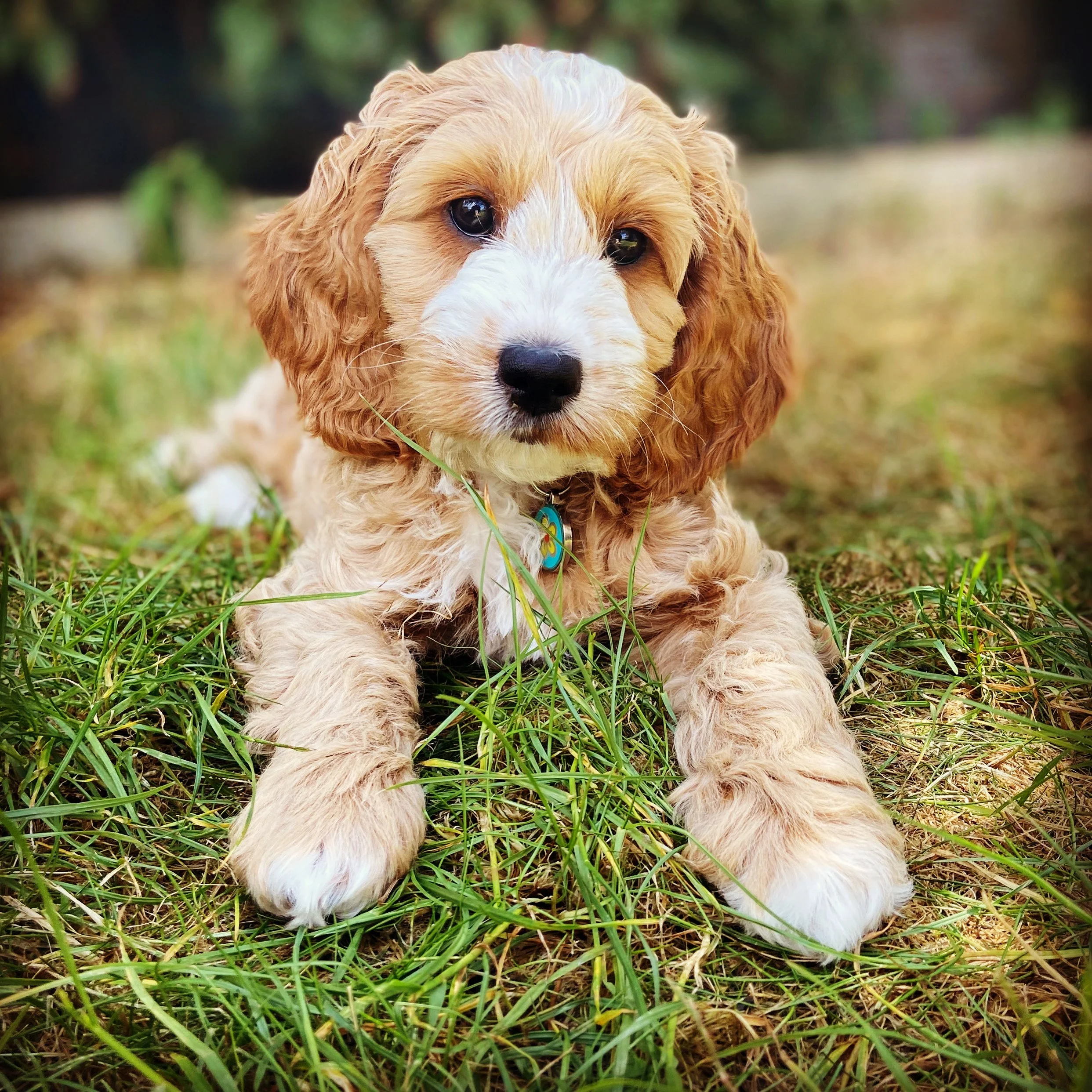 image accessibility description: a cockapoo puppy lying on the grass