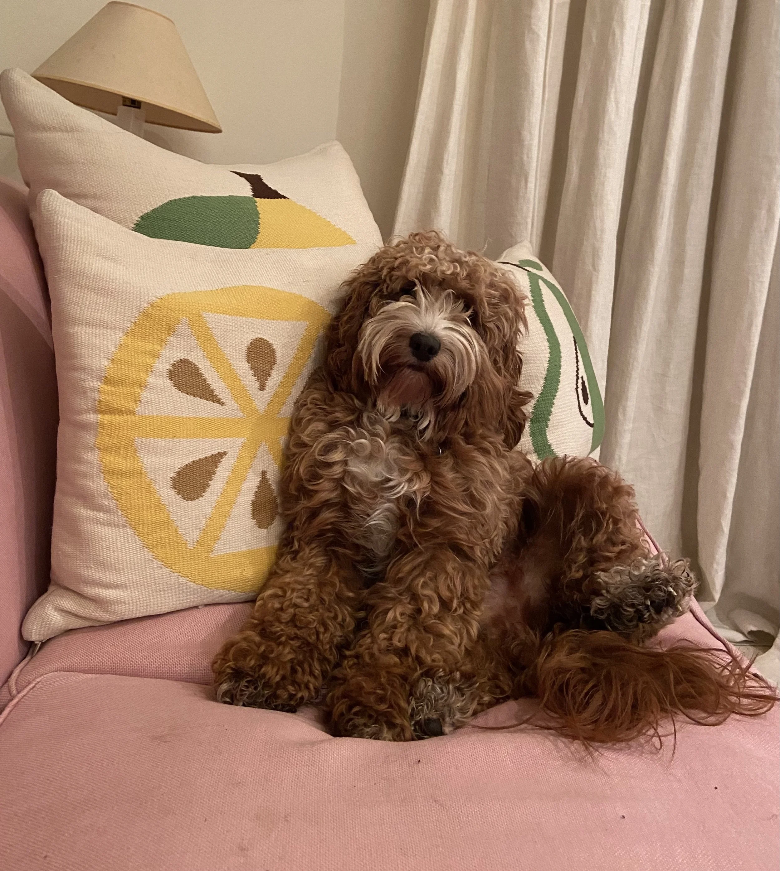 image accessibility description: a fluffy cockapoo dog sits on a sofa surrounded by cushions; she has a soft expression while looking at the camera.